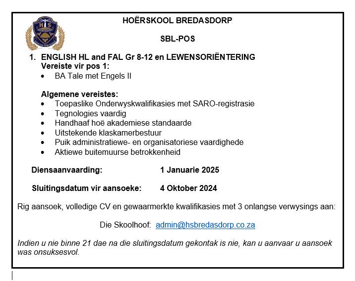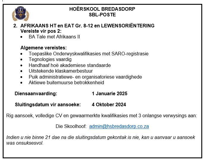 Uncategorised VAKANTE POSTE Posted on 18 September 202418 September 2024 by Estelle Genis Estelle Genis HOKKIE BREDASDORP HIGH SCHOOL SAYS THANK YOU